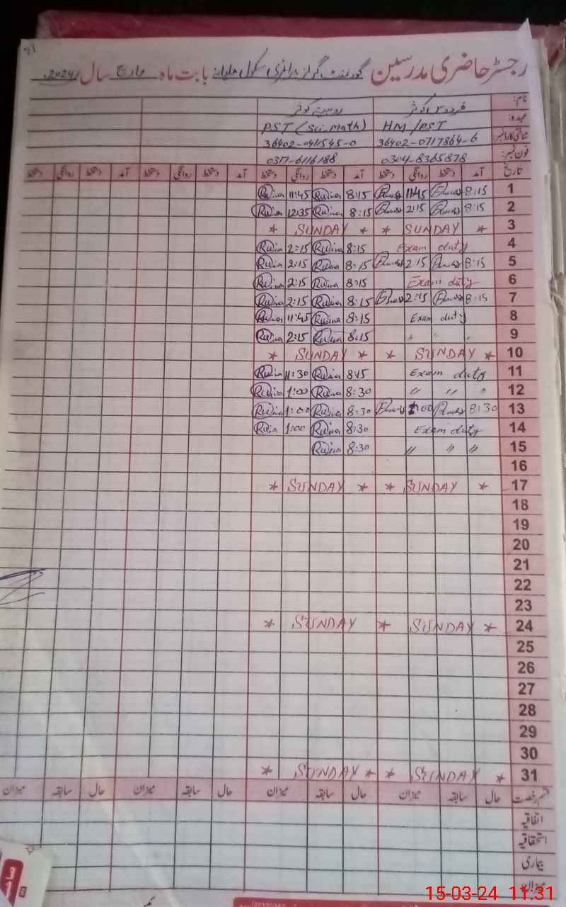 | 36**** | Fi**** Ka**** | PST | Regular | 2 | 1 | 0 | 0 | 0 | 0 | 0 | 0 | 2 | Exam Duty |
