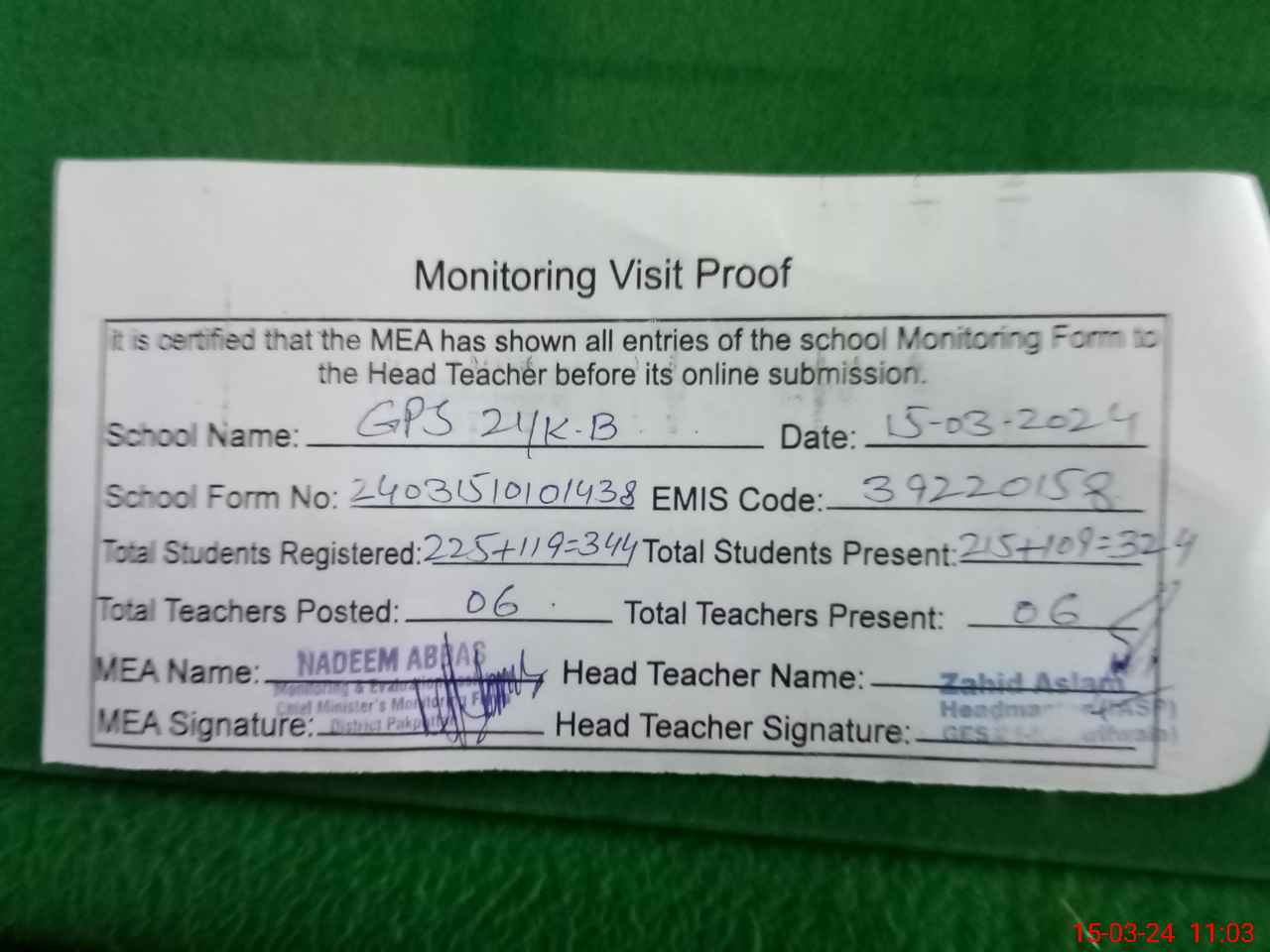 | EMIS Code: 39220158 | Name of School: GPS CHAK NO. 21 KB | |||