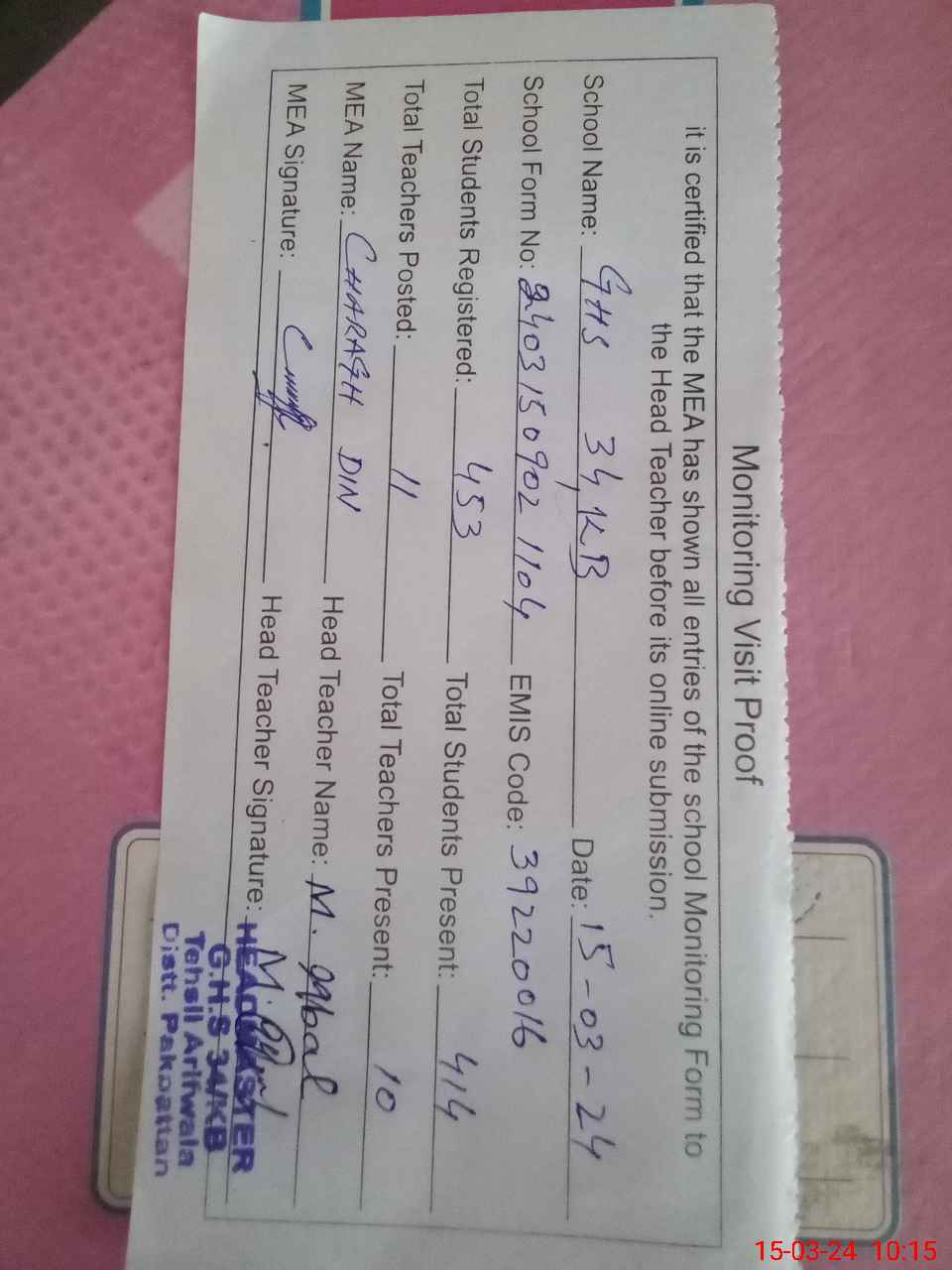| EMIS Code: 39220016 | Name of School: GHS CHAK NO.34/KB | |||