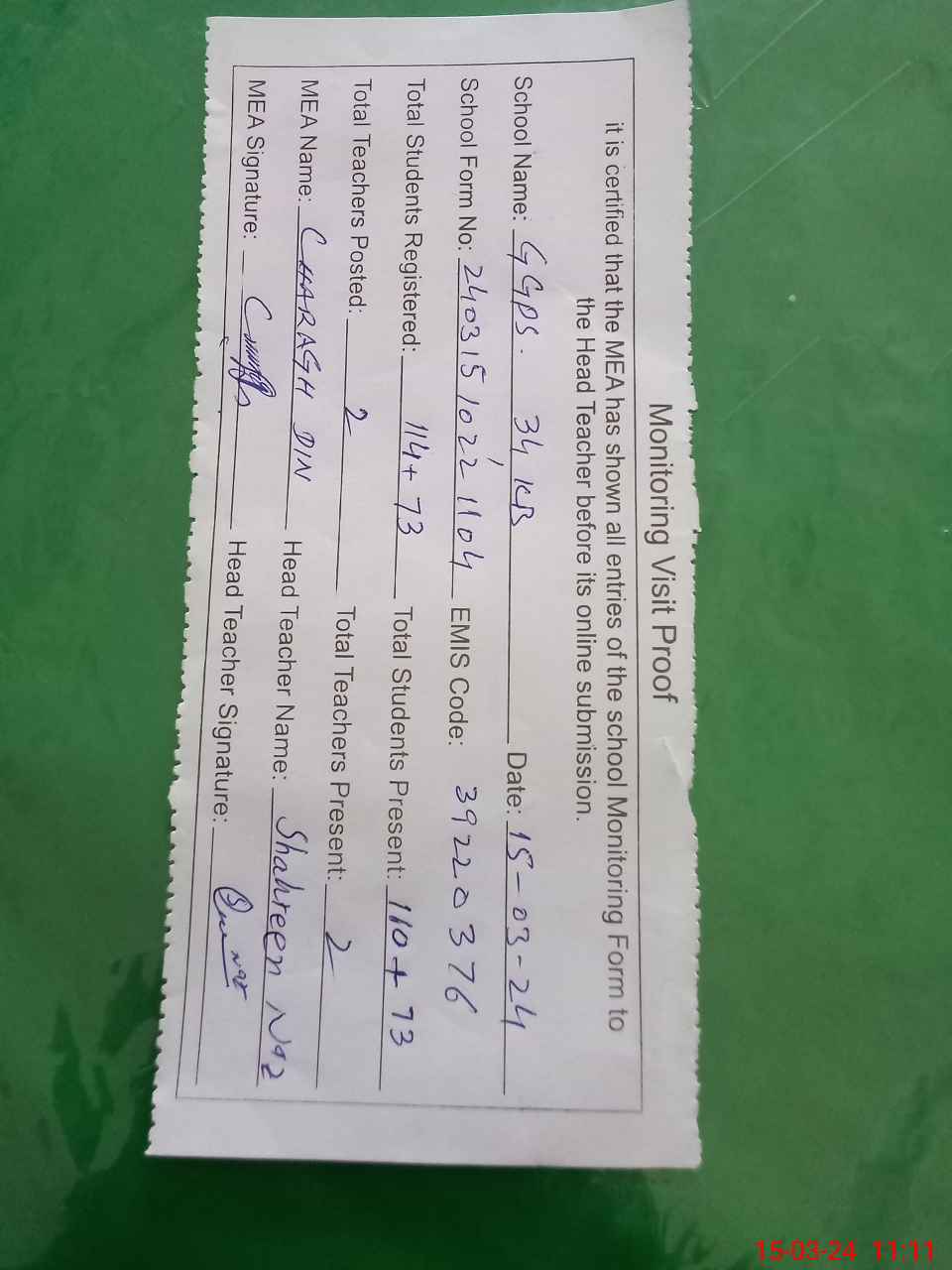 | Attendance Register | Head Teacher | MEA with School | Visit Proof |