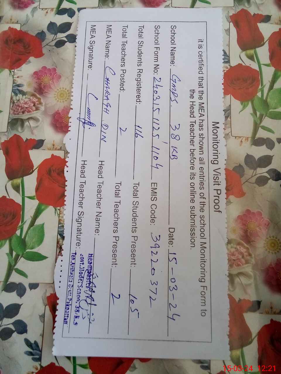 | EMIS Code: 39220372 | Name of School: GMPS CHAK NO 38 KB | |||