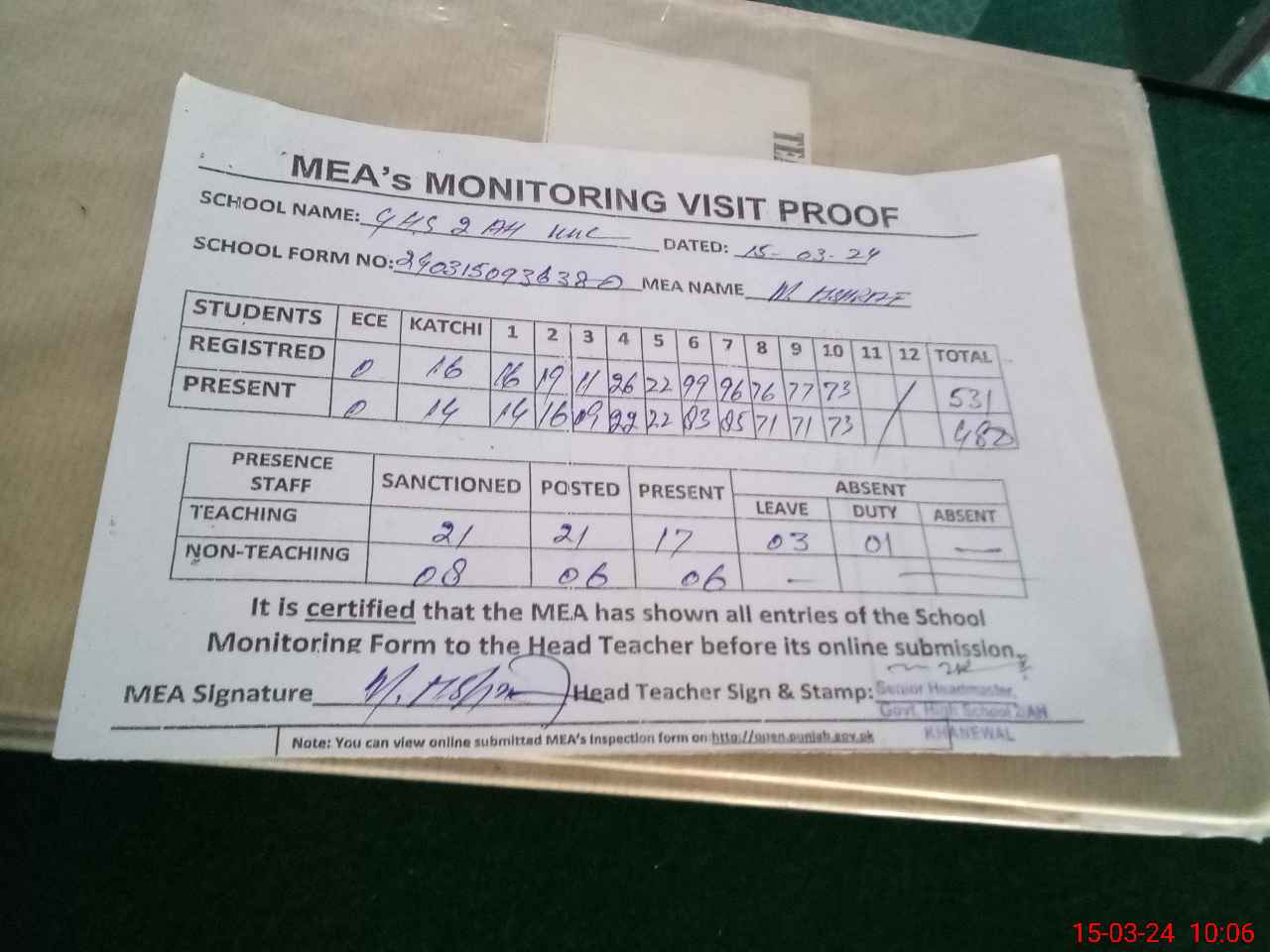 | Attendance Register | Head Teacher | MEA with School | Visit Proof |