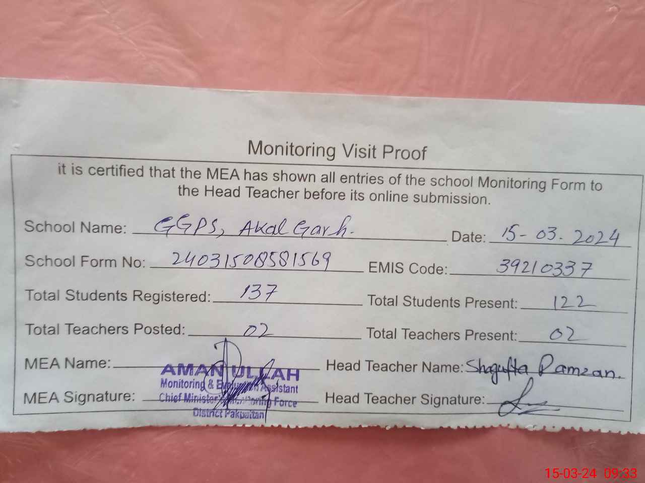 | Attendance Register | Head Teacher | MEA with School | Visit Proof |