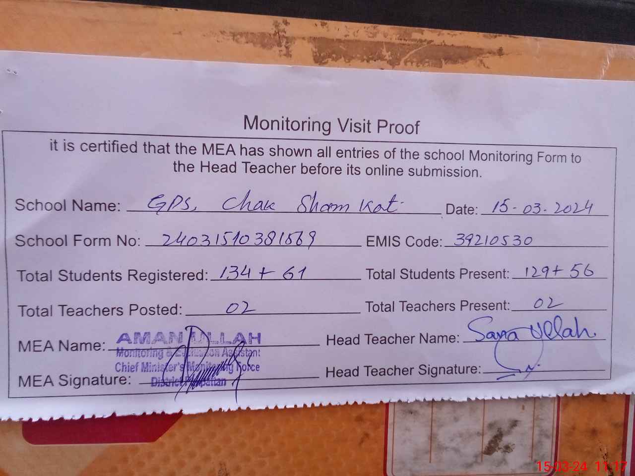 | Attendance Register | Head Teacher | MEA with School | Visit Proof |