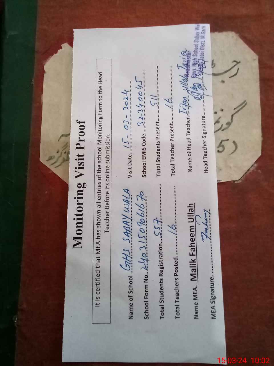 | Attendance Register | Head Teacher | MEA with School | Visit Proof |