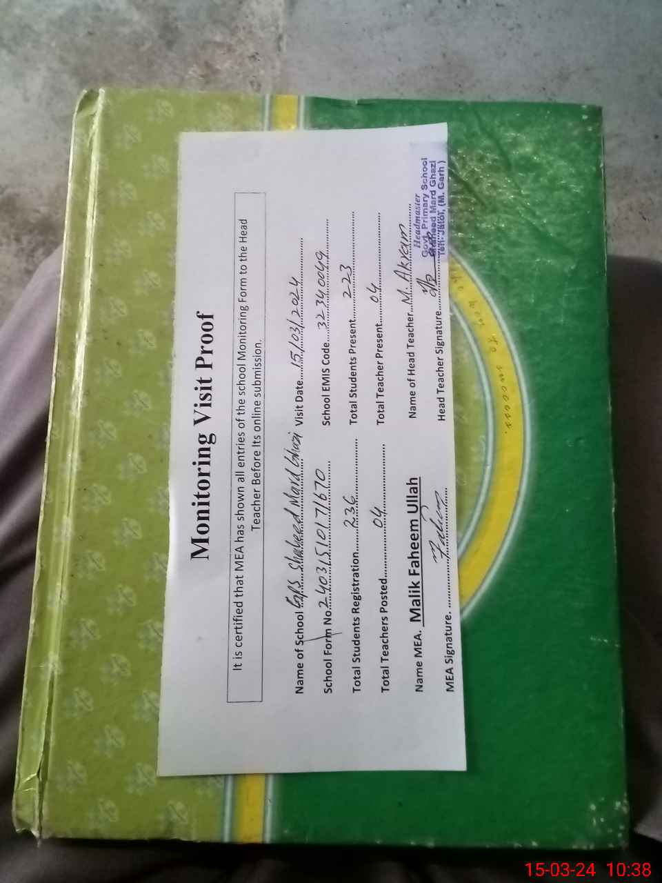 | Attendance Register | Head Teacher | MEA with School | Visit Proof |