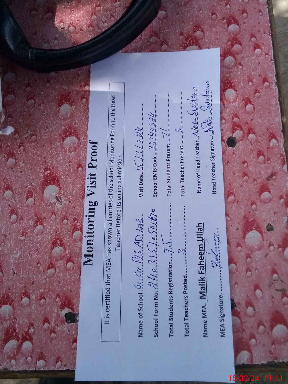 | Attendance Register | Head Teacher | MEA with School | Visit Proof |