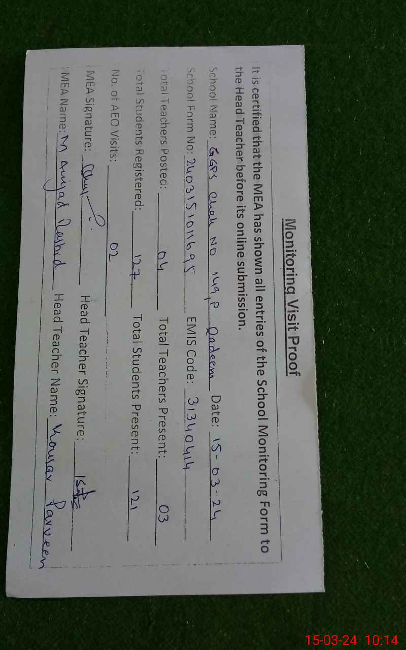 | EMIS Code: 31340414 | Name of School: GGPS 149/P QADEEM SADIQABAD | |||