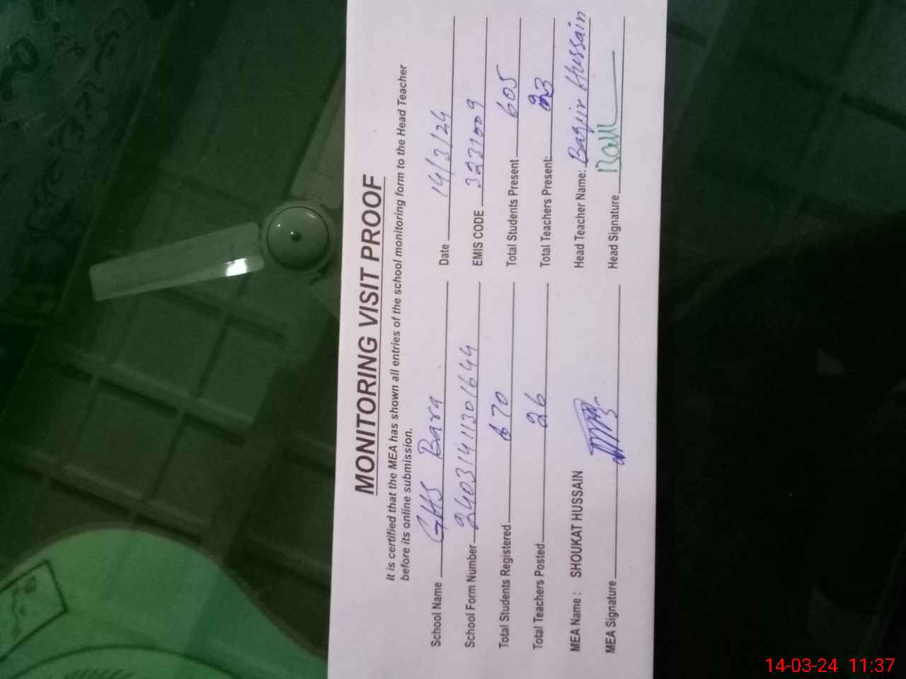 | Attendance Register | Head Teacher | MEA with School | Visit Proof |