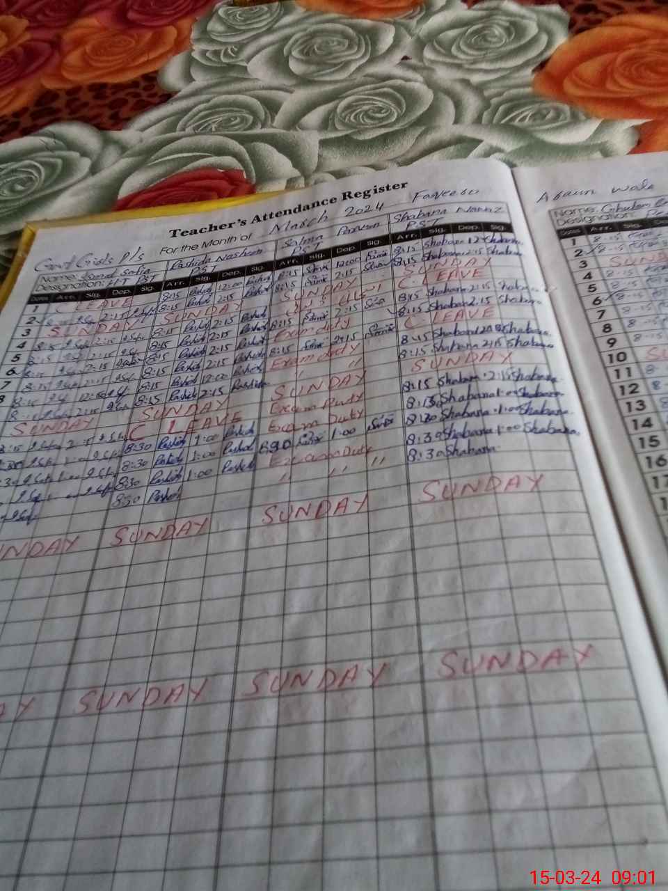 | 32**** | Sa**** Pa**** | 1 | 1 | 0 | 0 | 0 | 0 | 0 | 0 | 0 | 0 | 0 | Exam Duty |