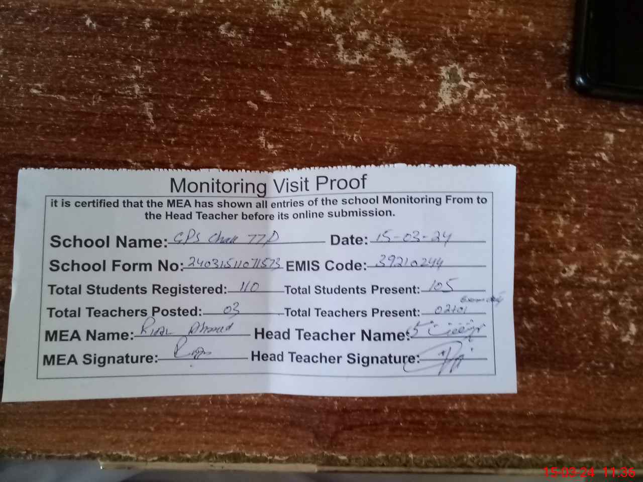 | Attendance Register | Head Teacher | MEA with School | Visit Proof |