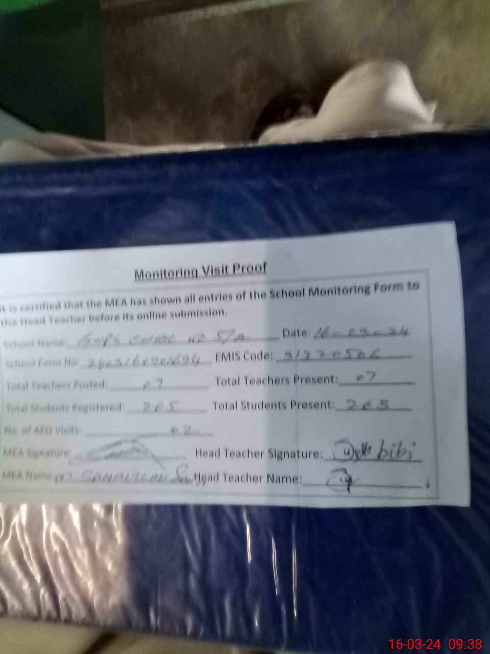 | Attendance Register | Head Teacher | MEA with School | Visit Proof |