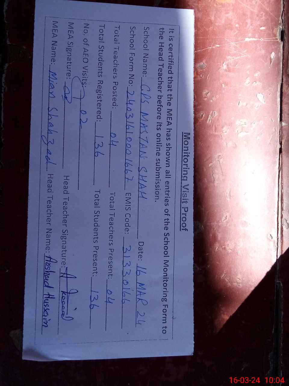 | EMIS Code: 31330166 | Name of School: GPS MASTAN SHAH | |||