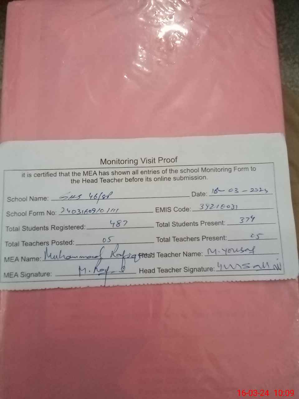 | EMIS Code: 39210031 | Name of School: GHS CHAK NO. 46/SP PAKPATTAN | |||