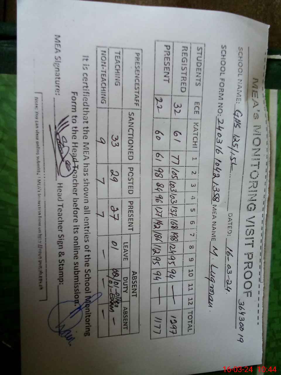 | Attendance Register | Head Teacher | MEA with School | Visit Proof |