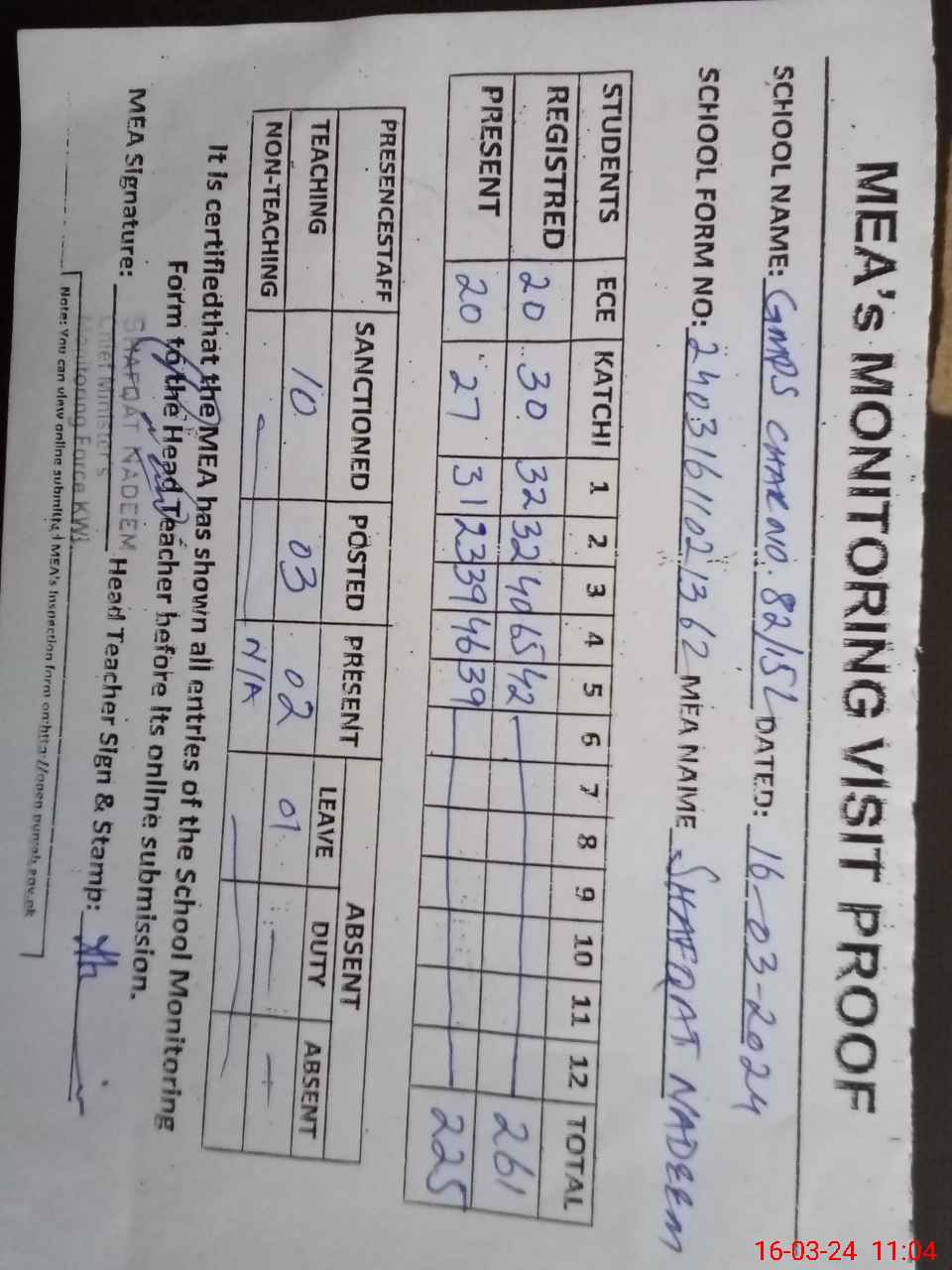 | Attendance Register | Head Teacher | MEA with School | Visit Proof |