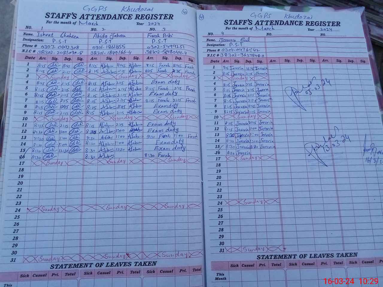 | CNIC | Full Name | Designation | R/C | Absence During Last Calender Month |