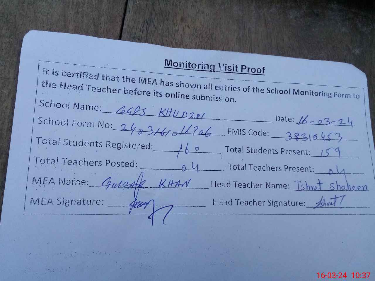 | Attendance Register | Head Teacher | MEA with School | Visit Proof |