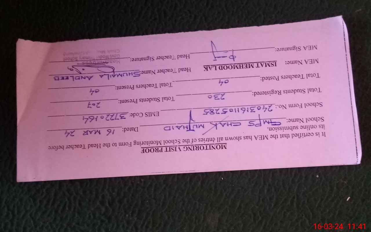 | Attendance Register | Head Teacher | MEA with School | Visit Proof |