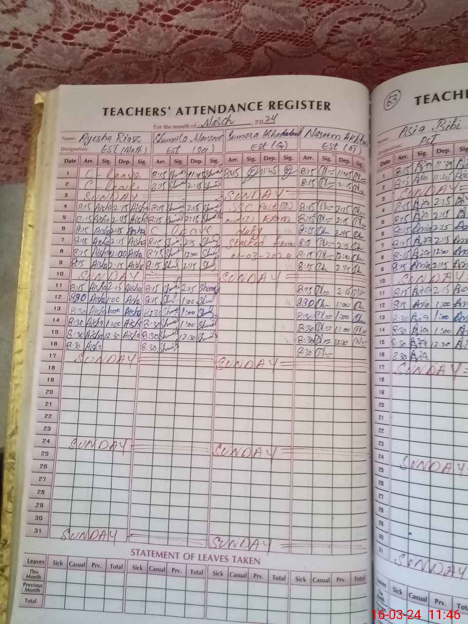 | 31**** | Su**** Kh**** | Regular | 5 | 0 | 0 | 0 | 0 | 0 | 0 | 0 | 5 | Exam Duty | |