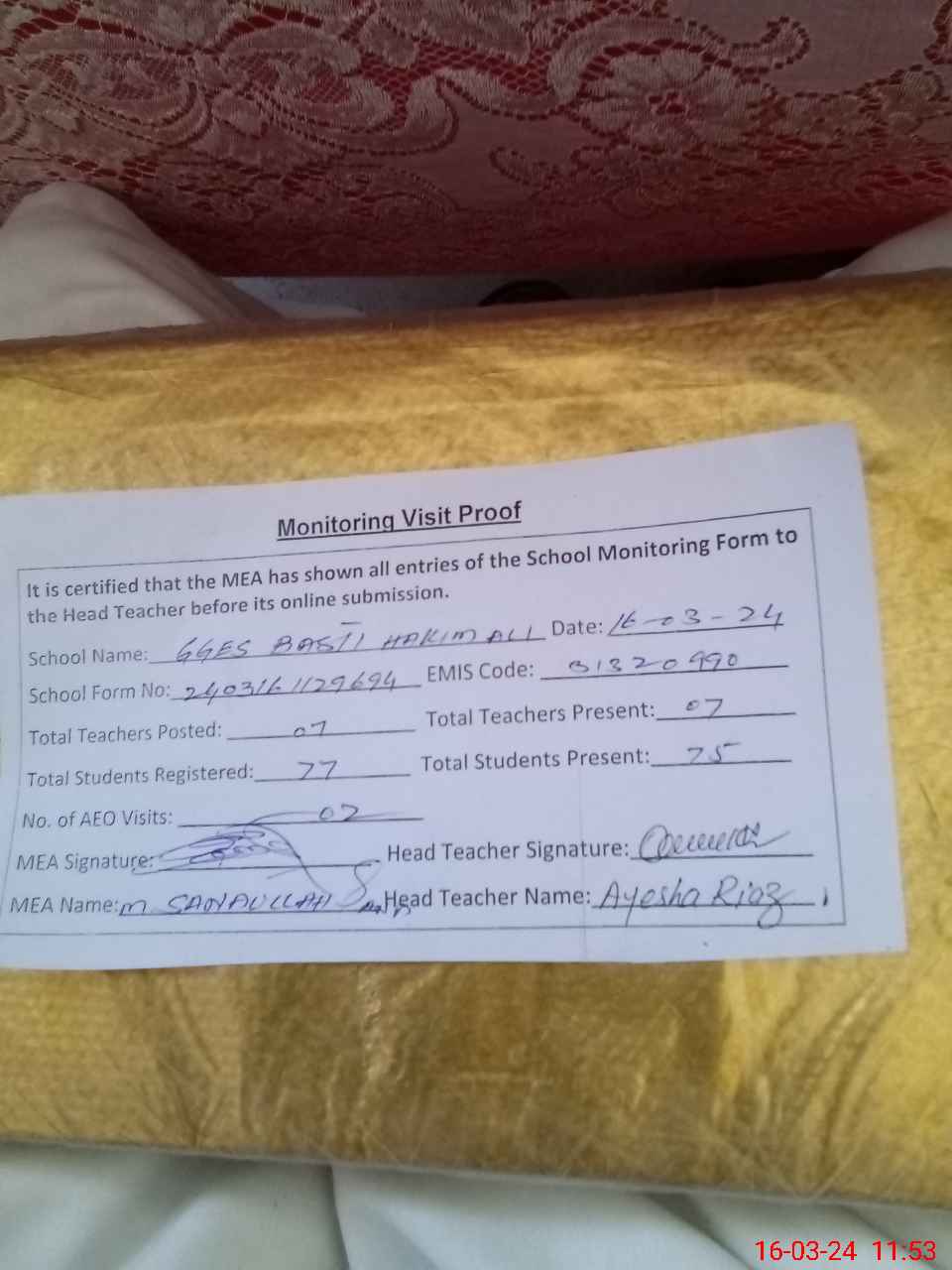 | Monitoring Date: 16-03-2024 | Start Time: 16-03-2024 11:28 AM | End Time: 16-03-2024 11:57 AM | Name of MEA: Mu**** Sa**** Ul**** Sa**** | |