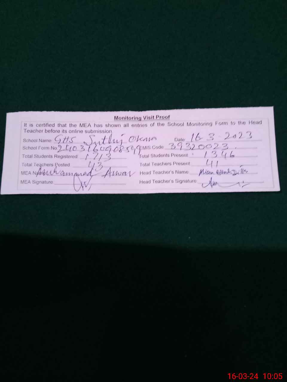 | Certified that this School was Inspected by the Undersigned MEA/DMO Today and the Information Stated Above is as Per Record. | |||||