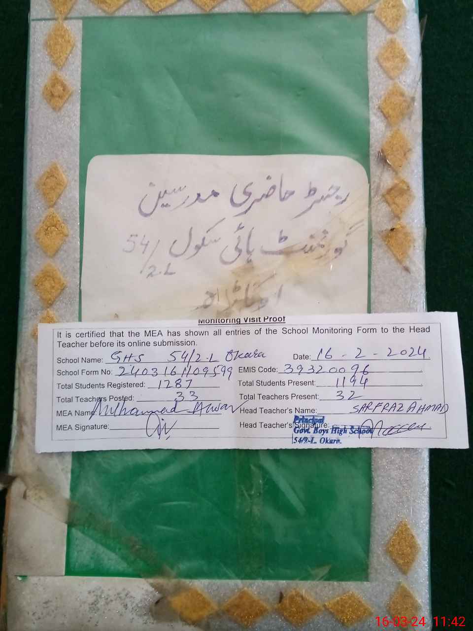 | EMIS Code: 39320096 | Name of School: GHS CHAK NO. 54/2-L | |||