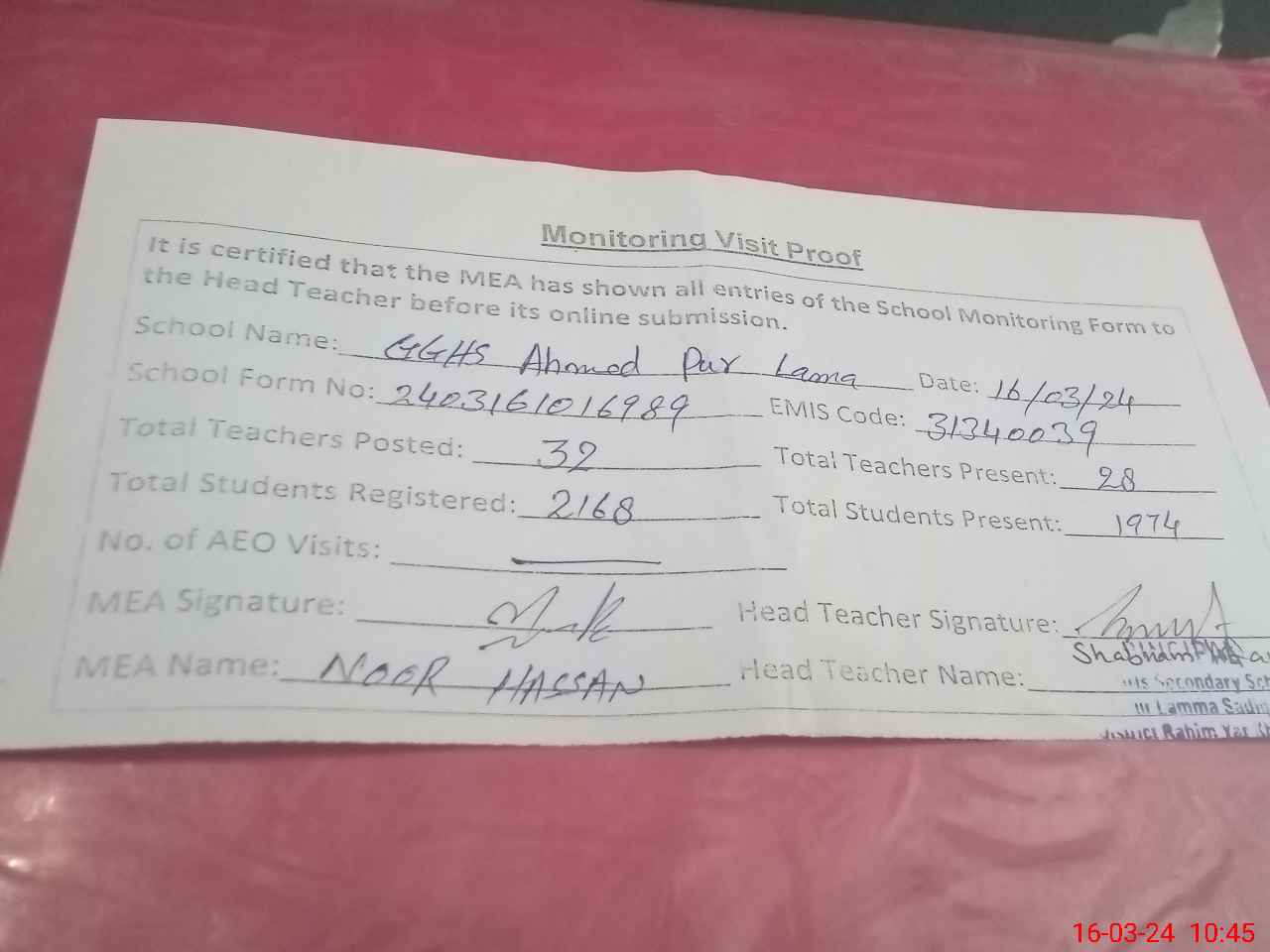 | Attendance Register | Head Teacher | MEA with School | Visit Proof |