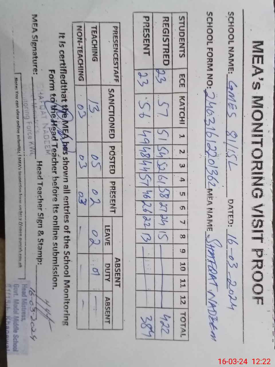 | Attendance Register | Head Teacher | MEA with School | Visit Proof |