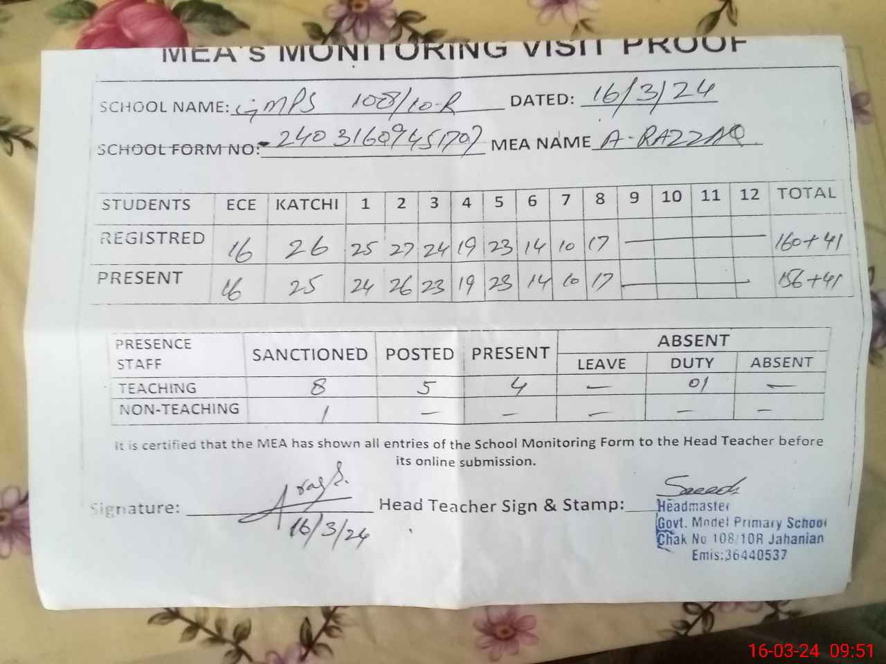 | Certified that this School was Inspected by the Undersigned MEA/DMO Today and the Information Stated Above is as Per Record. | |||||
