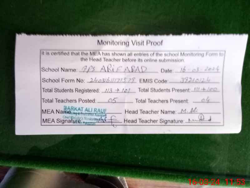 | EMIS Code: 39210124 | Name of School: GPS ARIF ABAD | |||