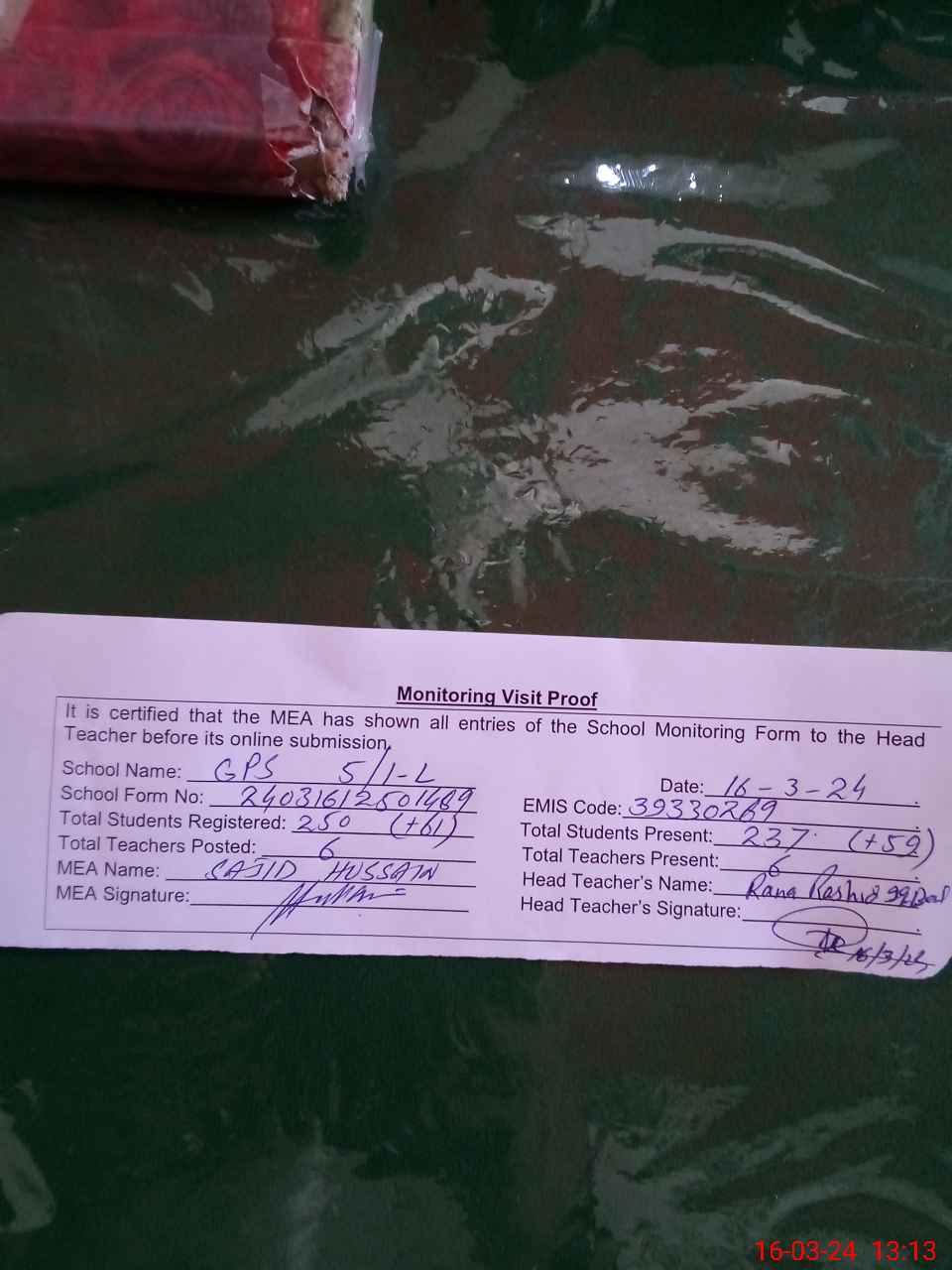 | Attendance Register | Head Teacher | MEA with School | Visit Proof |