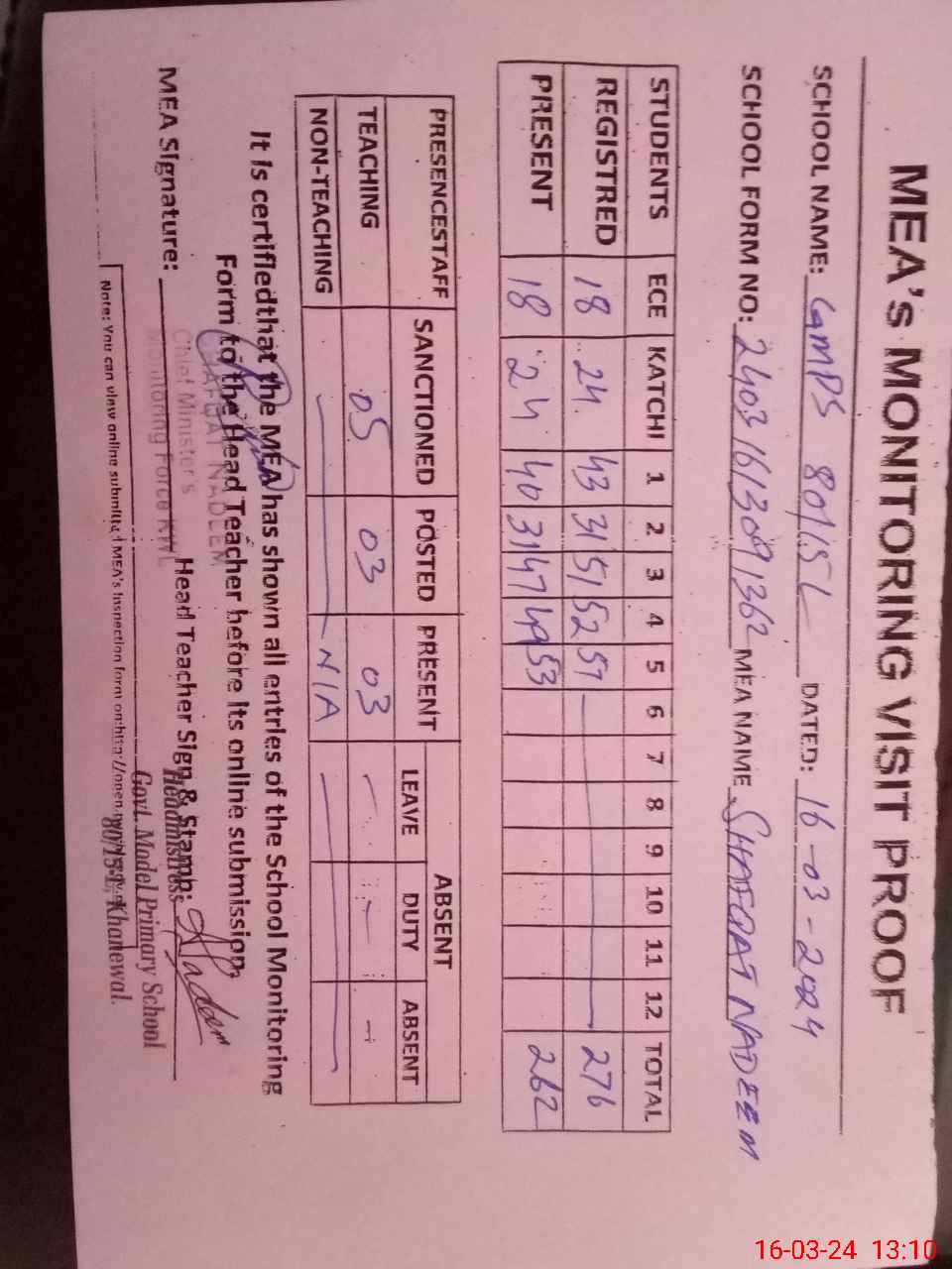 | Attendance Register | Head Teacher | MEA with School | Visit Proof |