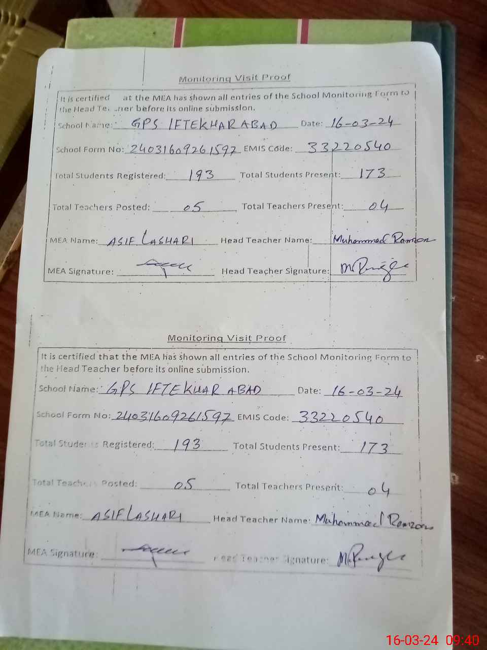 | Attendance Register | Head Teacher | MEA with School | Visit Proof |