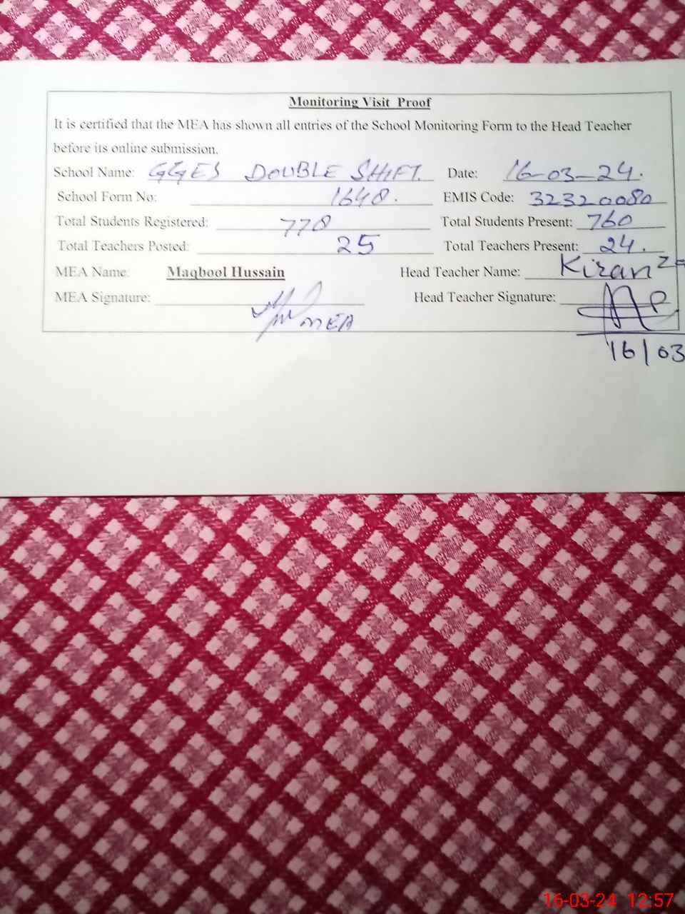 | Attendance Register | Head Teacher | MEA with School | Visit Proof |