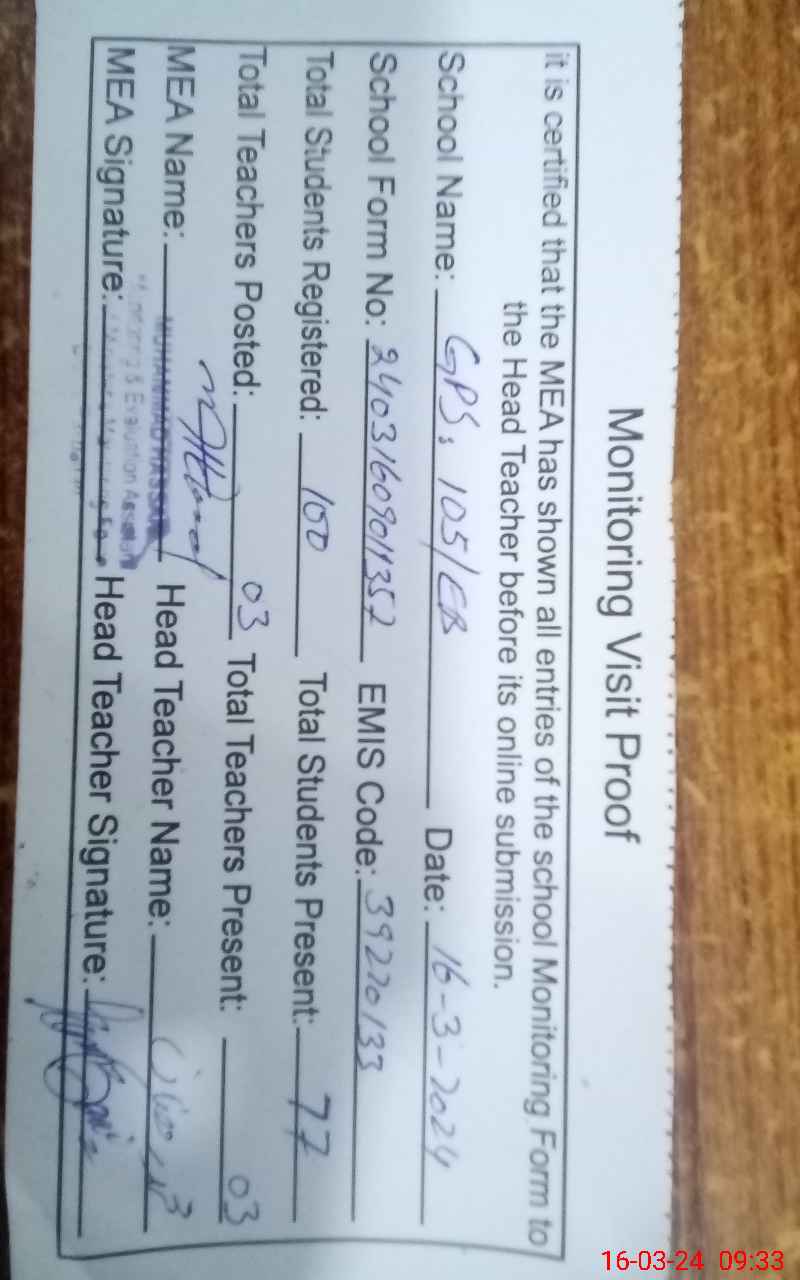| EMIS Code: 39220133 | Name of School: GPS 105 EB ARIFWALA | |||