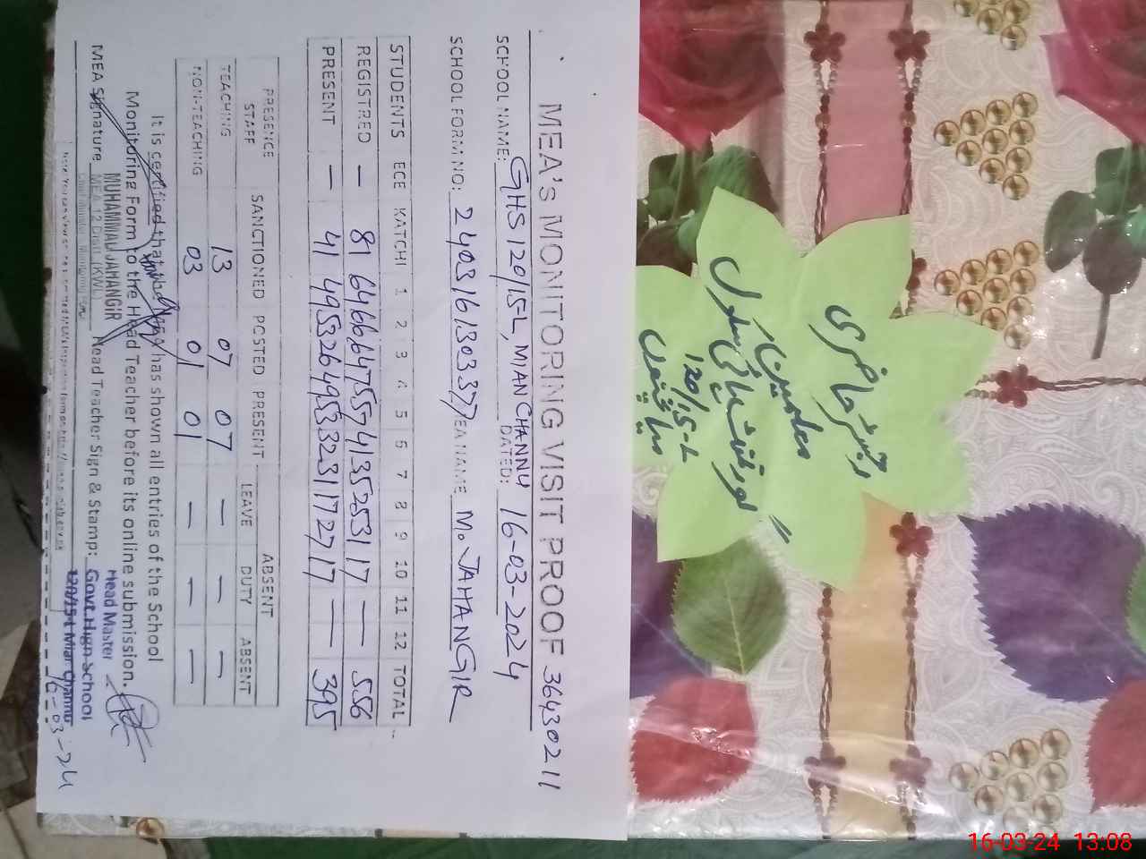 | EMIS Code: 36430211 | Name of School: GHS 120/15-L, MIAN CHANNU | |||