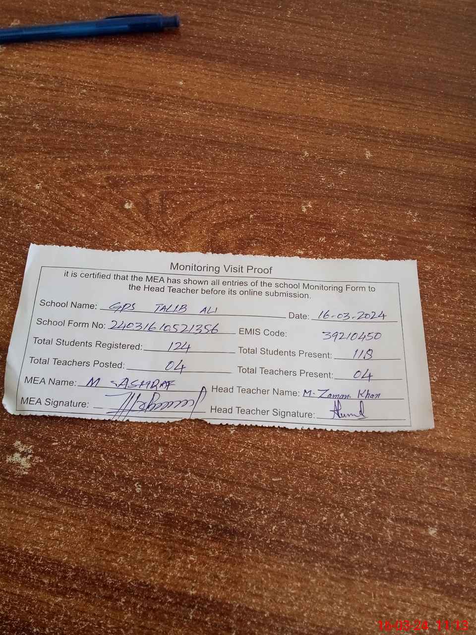 | EMIS Code: 39210450 | Name of School: GPS TALIB ALI P/O 26 S.P | |||
