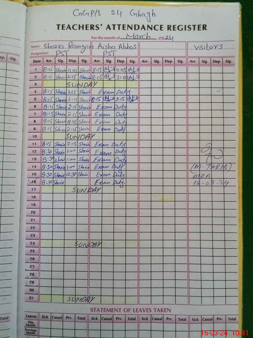 | 36**** | Ai**** Ab**** | 1 | 1 | 0 | 0 | 0 | 0 | 0 | 0 | 0 | 0 | 0 | Exam Duty |