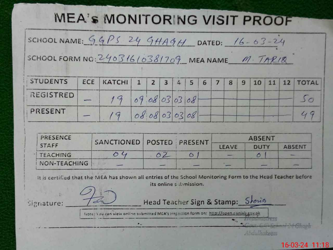 | Attendance Register | Head Teacher | MEA with School | Visit Proof |