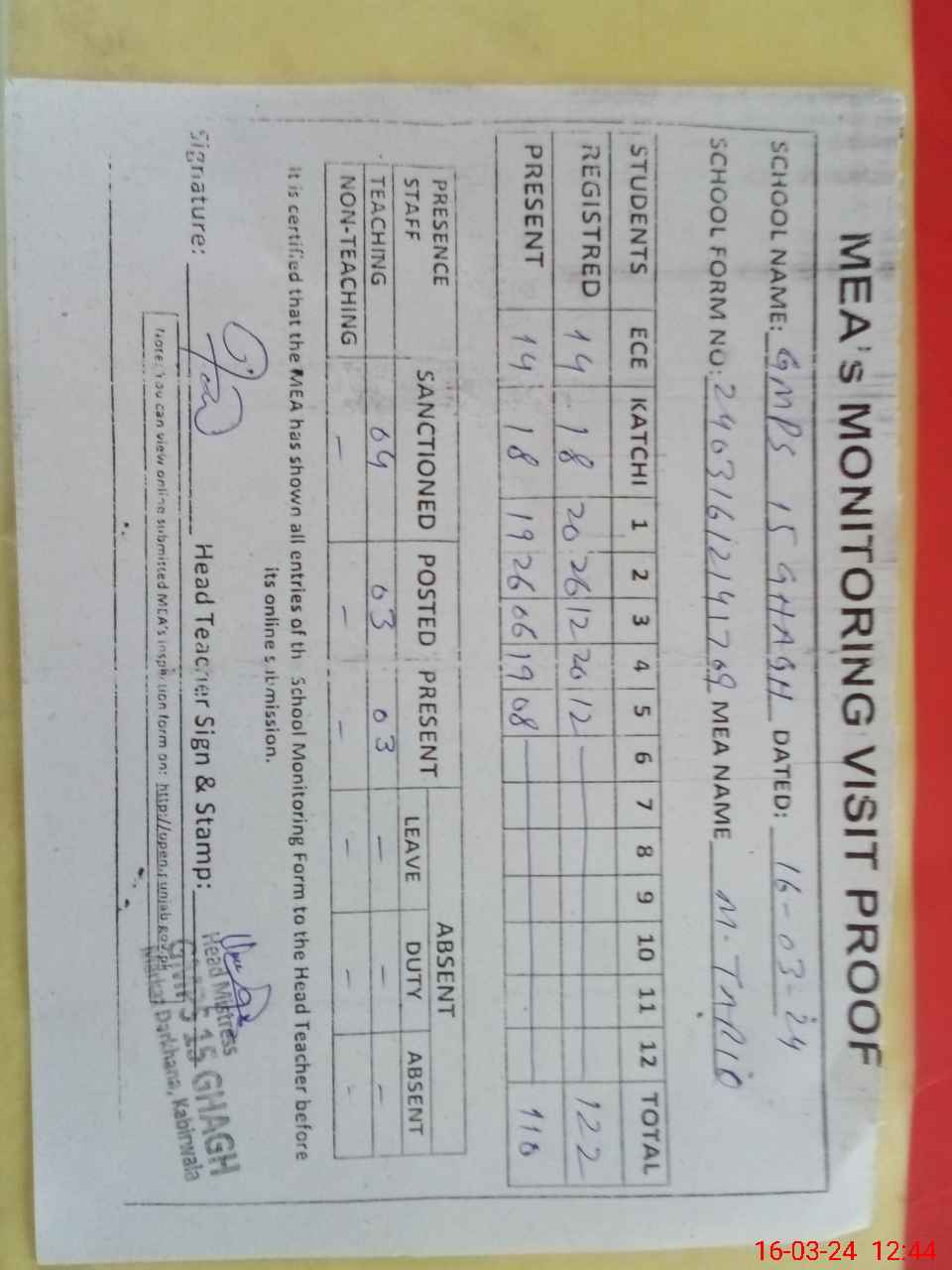 | Attendance Register | Head Teacher | MEA with School | Visit Proof |
