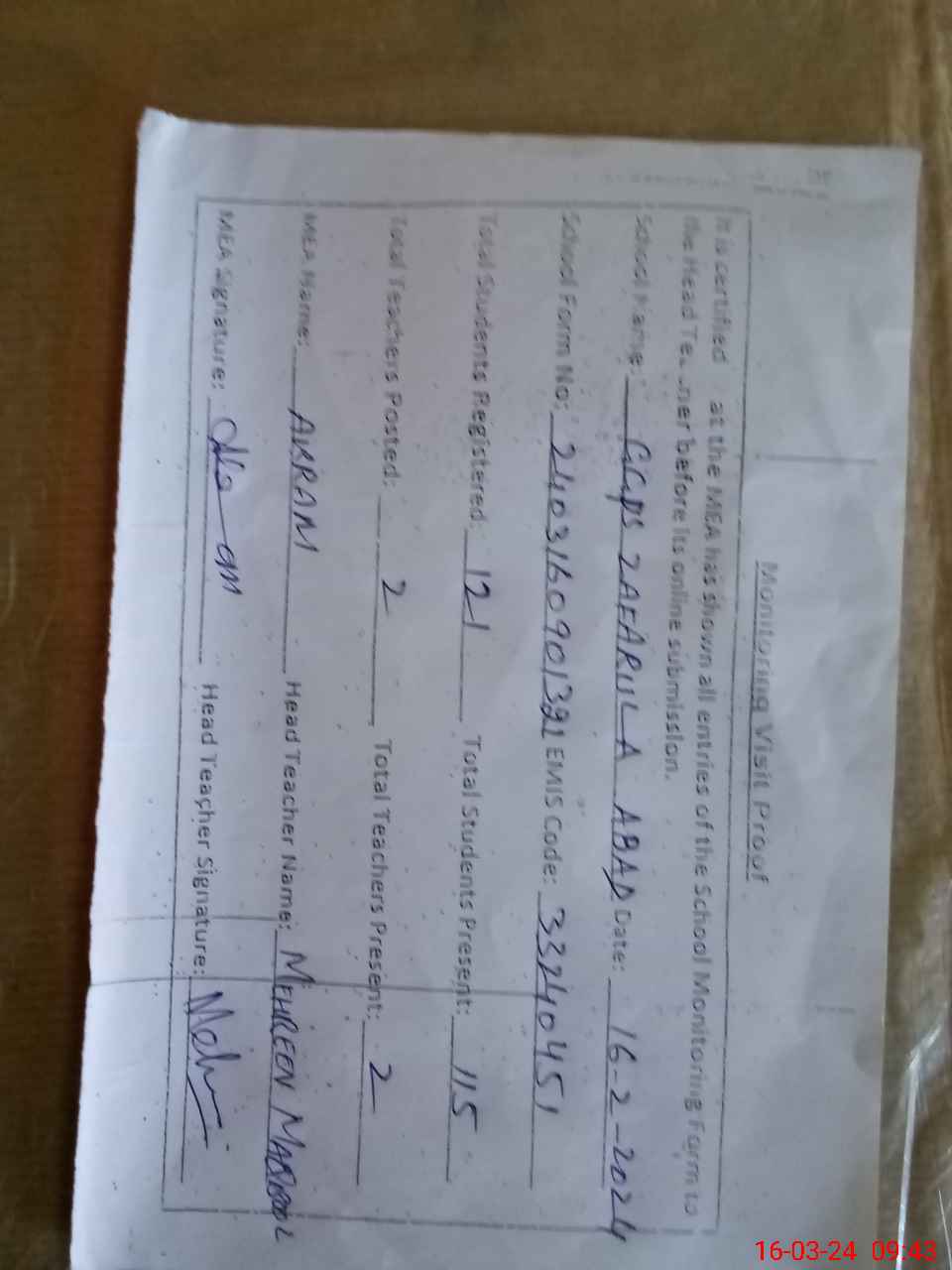 | EMIS Code: 33240451 | Name of School: GGPS ZAFARULA ABAD | |||