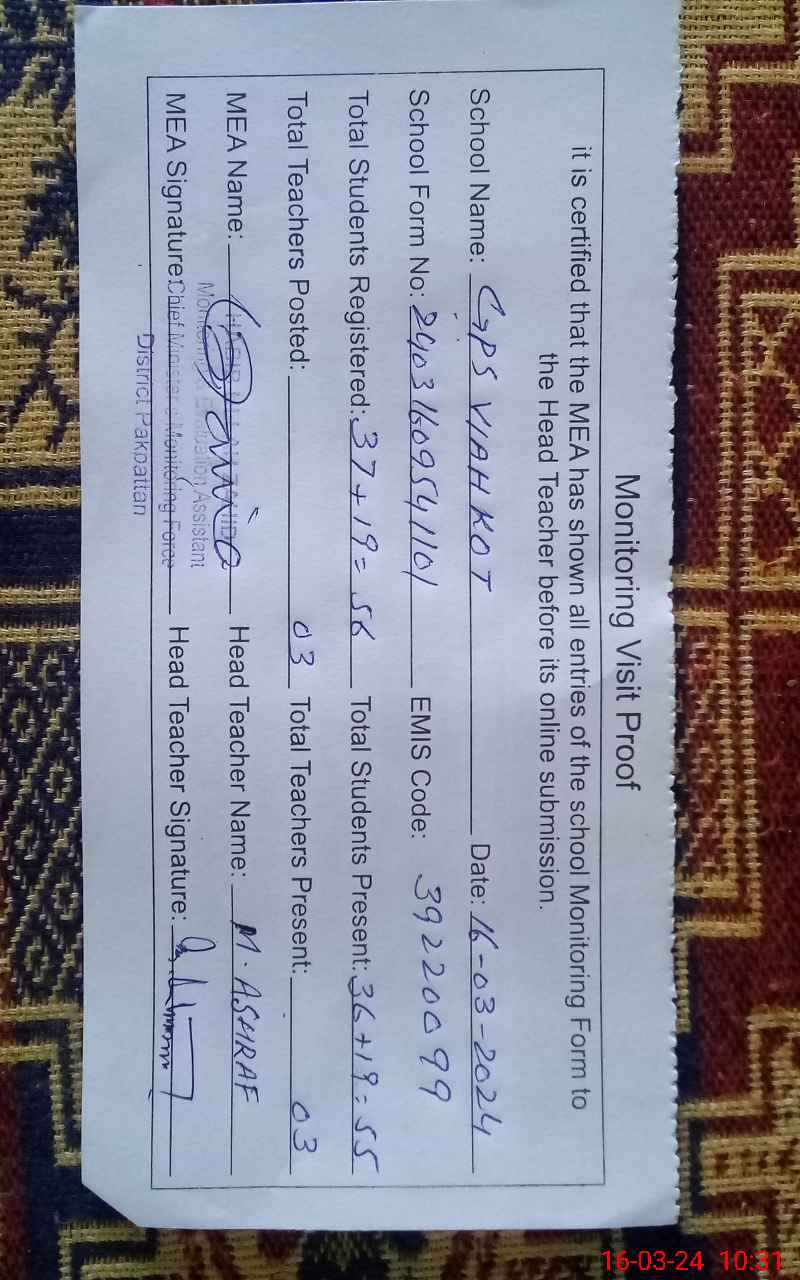 | EMIS Code: 39220099 | Name of School: GPS VIAH KOT | |||