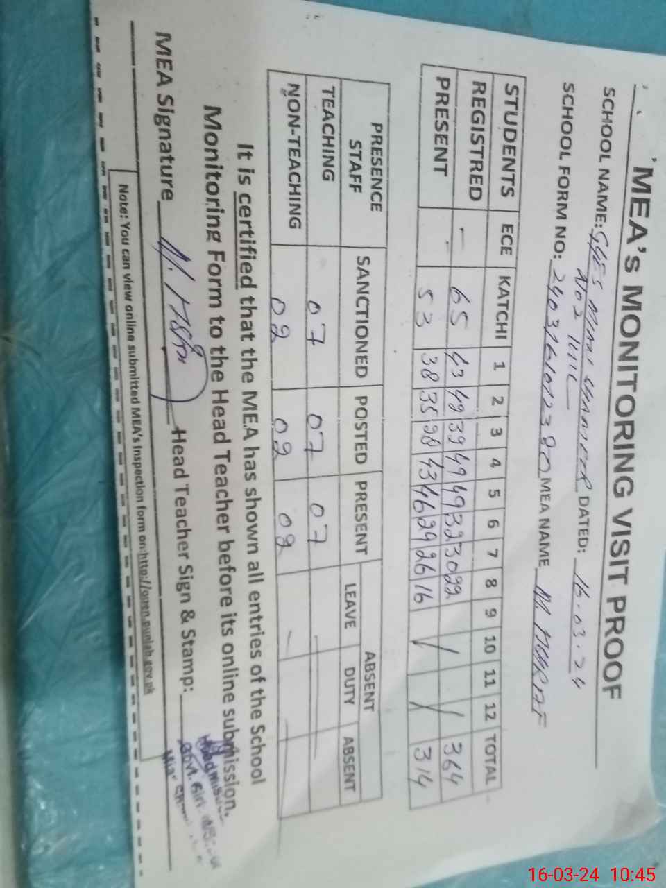 | Certified that this School was Inspected by the Undersigned MEA/DMO Today and the Information Stated Above is as Per Record. | |||||