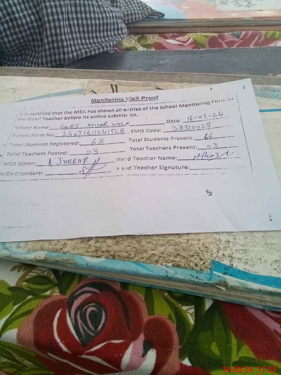 | Attendance Register | Head Teacher | MEA with School | Visit Proof |