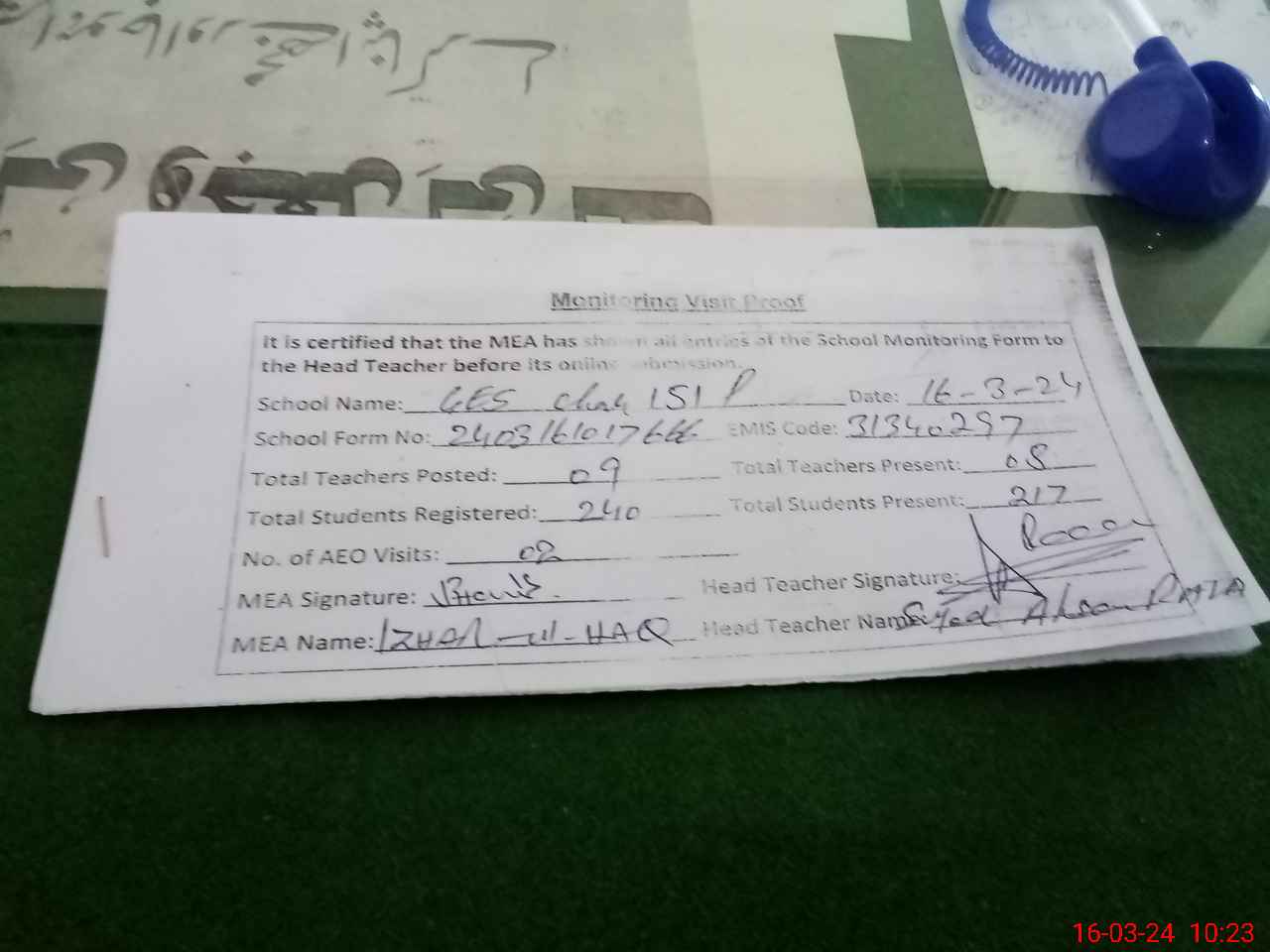 | Monitoring Date: 16-03-2024 | Start Time: 16-03-2024 09:58 AM | End Time: 16-03-2024 10:24 AM | Name of MEA: Mu**** Iz**** UlHa**** | |