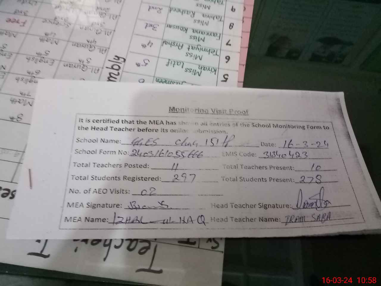 | Attendance Register | Head Teacher | MEA with School | Visit Proof |