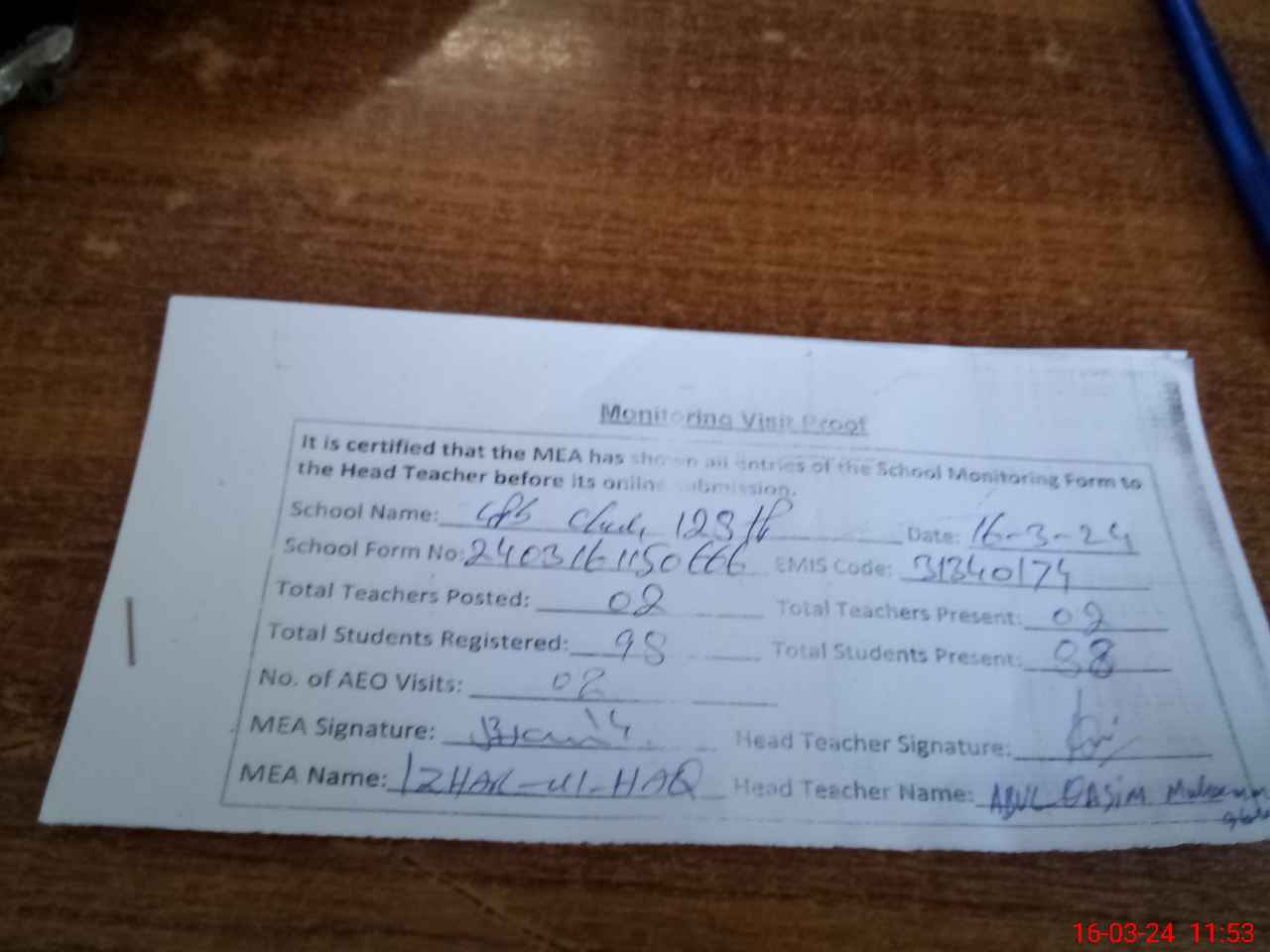 | Monitoring Date: 16-03-2024 | Start Time: 16-03-2024 11:33 AM | End Time: 16-03-2024 11:55 AM | Name of MEA: Mu**** Iz**** UlHa**** | |