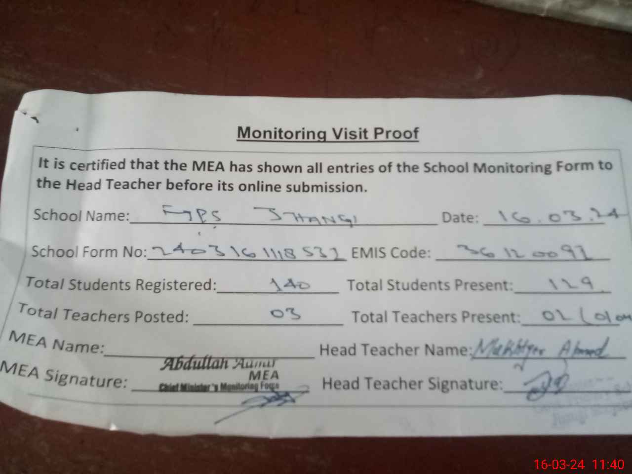 | Attendance Register | Head Teacher | MEA with School | Visit Proof |