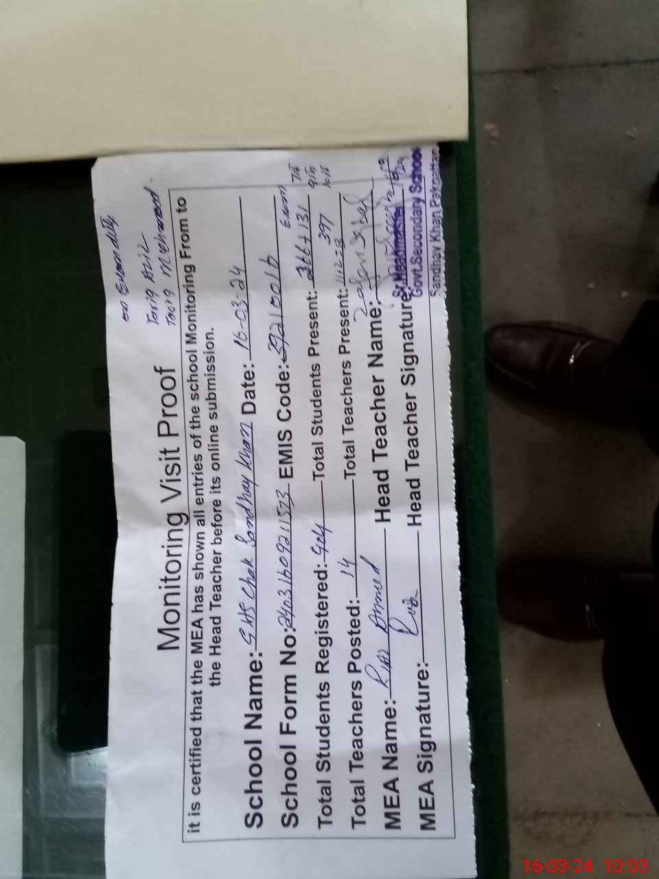 | EMIS Code: 39210016 | Name of School: GHS CHAK SANDHAY KHAN | |||